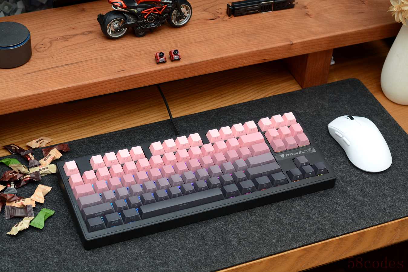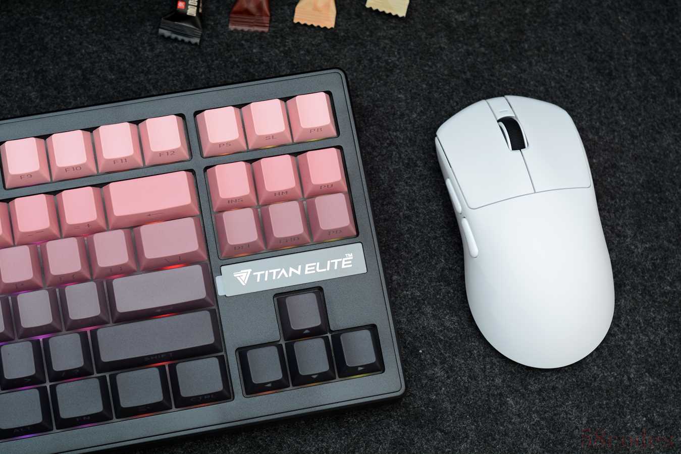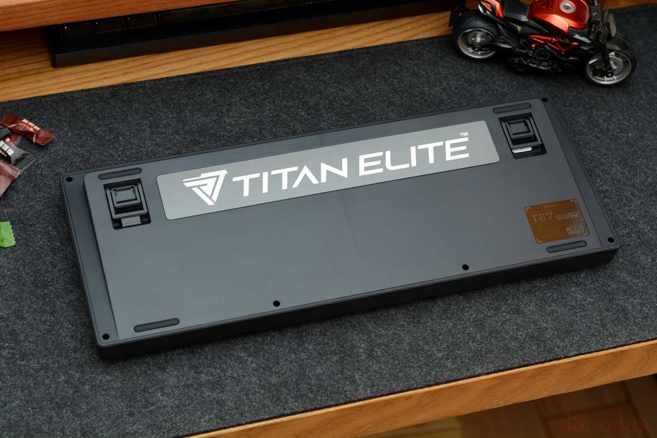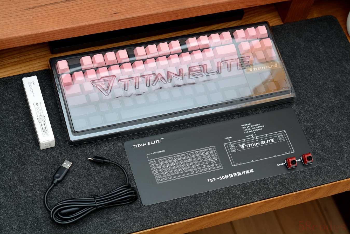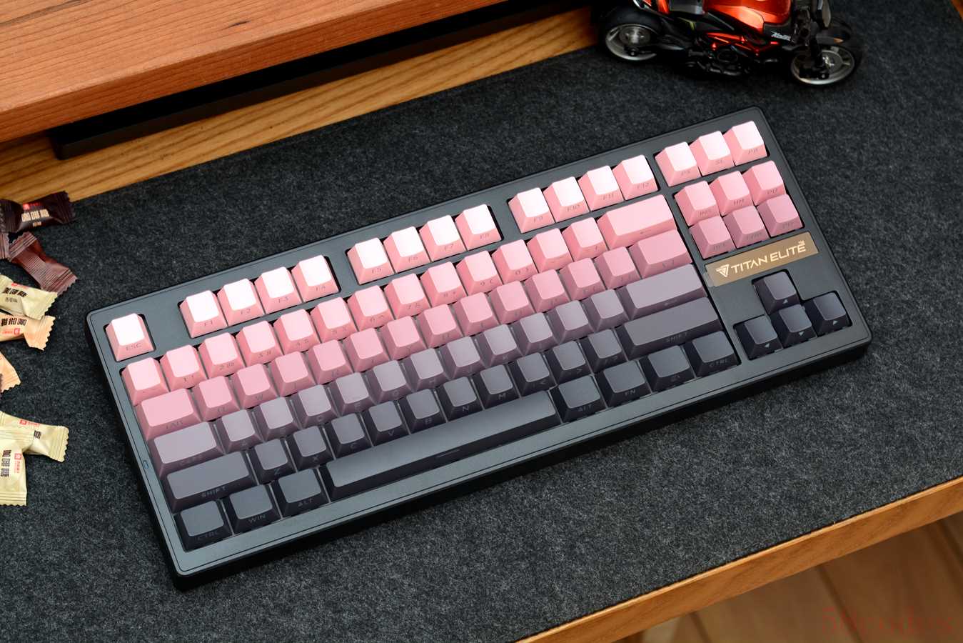 T87虽然价格很亲民,但分量不轻,取快递时一只手提着都有点吃力。跟名称一样,键盘采用常规的87键布局,内嵌式设计,方向键上部贴有泰坦精英英文LOGO。我手上这款为黑莓粉配色,黑色外壳,搭配粉黑渐变键帽。