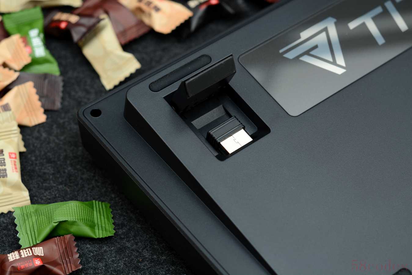 2.4G无线适配器藏在了底部支架内,T87内置了10000mAh容量电池。无线模式下,泰坦精英实验室数据为,灯效全开的情况下,连续使用,续航约50小时,关闭灯光的情况下,续航约2000小时。通过FN+右Alt键可以查看剩余电量,数字键1到0代表十个亮度等级。