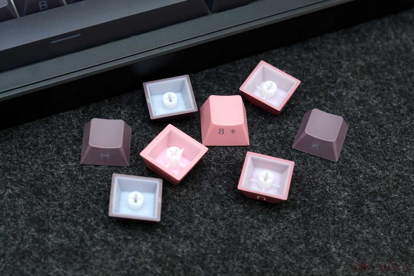 键盘自带原厂高度键帽,PBT材质,双色注塑工艺,侧透字体,键壁比较厚,水口很小,边缘处理的很干净。
