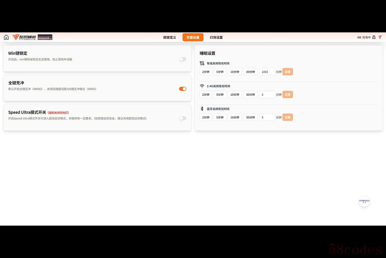 性能设置,可以对Win键锁定、全键无冲、Speed Ultra模式、睡眠时间进行设置。Speed Ultra模式默认关闭状态,打开后会强制关闭灯光,进入超低延迟模式,不过对轴体有一定的要求,如果出现双击建议关闭该模式。
