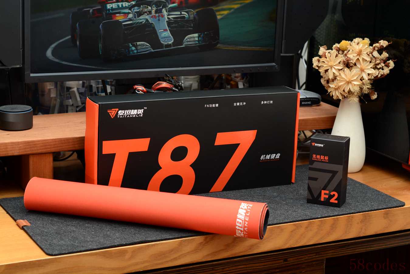 打开包装,内部含有T87机械键盘一把,大号鼠标垫一张,以及F2游戏鼠标一只,F2游戏鼠标采用PAW3311传感器,类GPW外观,轻量化设计。
