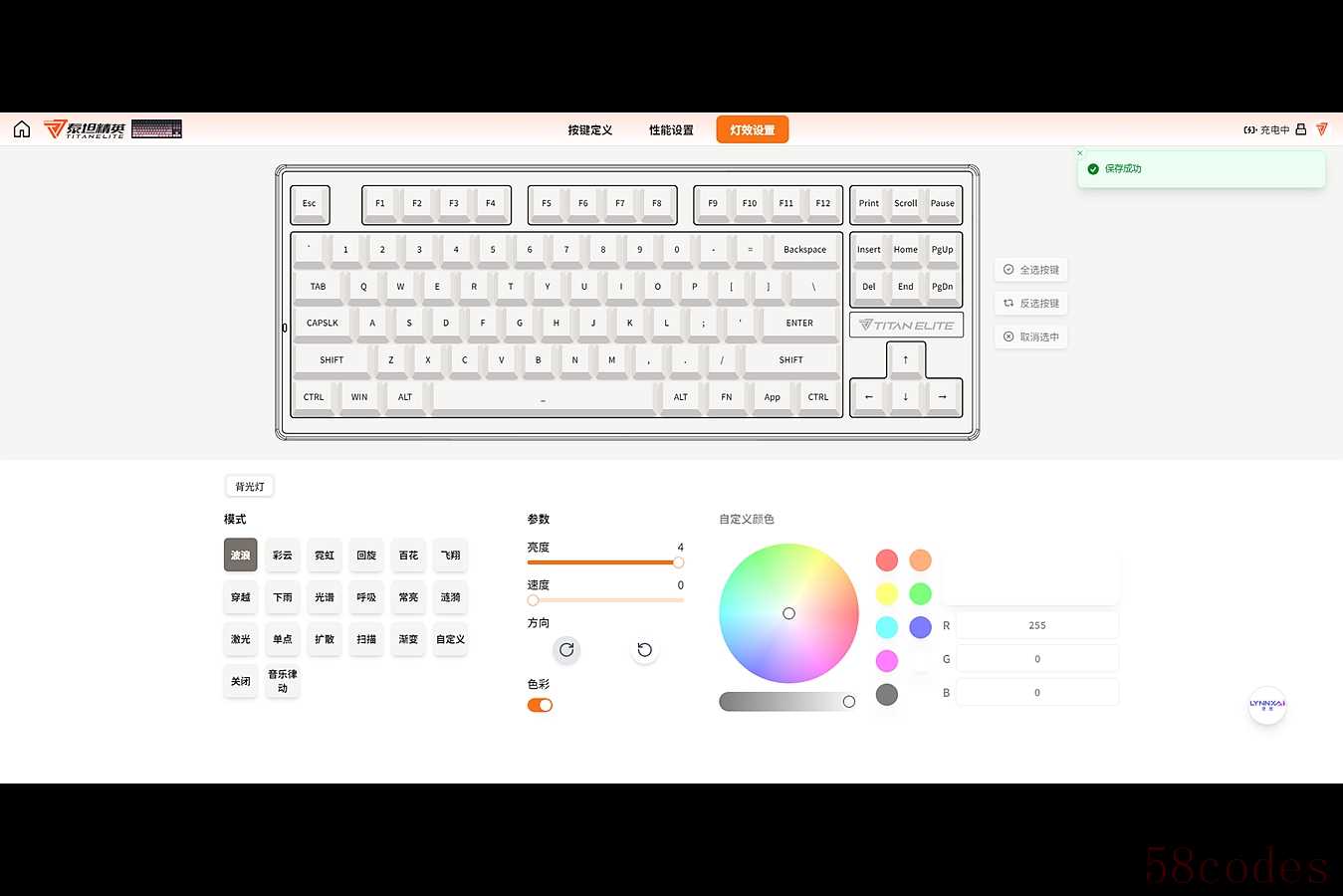 键盘默认彩色波浪灯效,除了驱动设置,也可以通过FN组合键来免驱设置,FN+↑↓调节灯光亮度,FN+←调节灯光方向,FN+→切换灯光颜色,FN+-和=调节灯光亮度,FN+切换灯光模式。