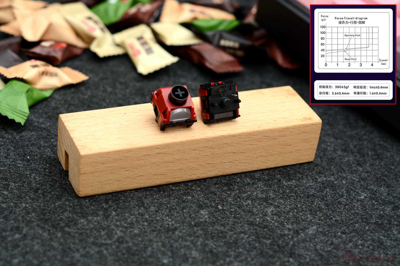 凯华MIX-5红轴采用红色POM上盖、黑色POM轴芯和黑色尼龙底座,以及雾透聚光镜,灯光更柔和均匀一些,底部采用五脚设计。轴体为线性手感,基本参数为38g初始压力,45g触发压力,1ms响应延迟,1.6mm触发行程,3.6mm总键程,设计寿命一亿次。