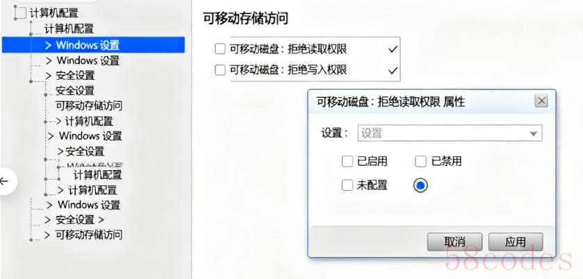 在右侧的设置列表中,找到 “可移动磁盘:拒绝读取权限” 和 “可移动磁盘:拒绝写入权限” 两个选项。