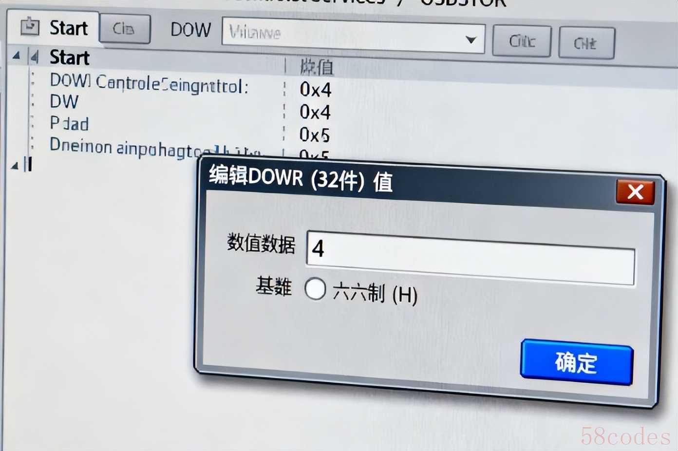 双击 “Start”,在弹出的 “编辑 DWORD 值” 窗口中,将 “数值数据” 修改为 “4”(“4” 代表禁用 USB 存储设备,默认值 “3” 代表启用),然后点击 “确定”。