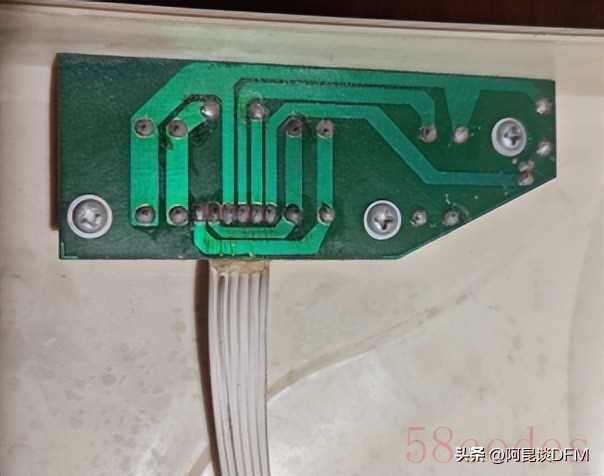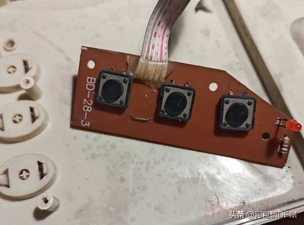 这是面板上“门铃、开锁、视频”的三个按键电路板,PCB板使用的是非常差的FR1纸板制作。整个工艺感觉都像是手工腐蚀做的PCB,甚至在开关面还有一个跳线,也不知道是不是设计的人没有走好线还是实在“无路可走”。