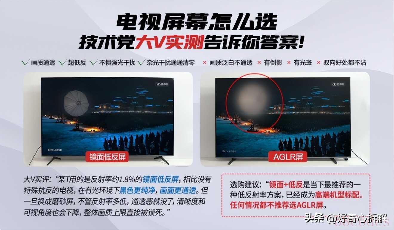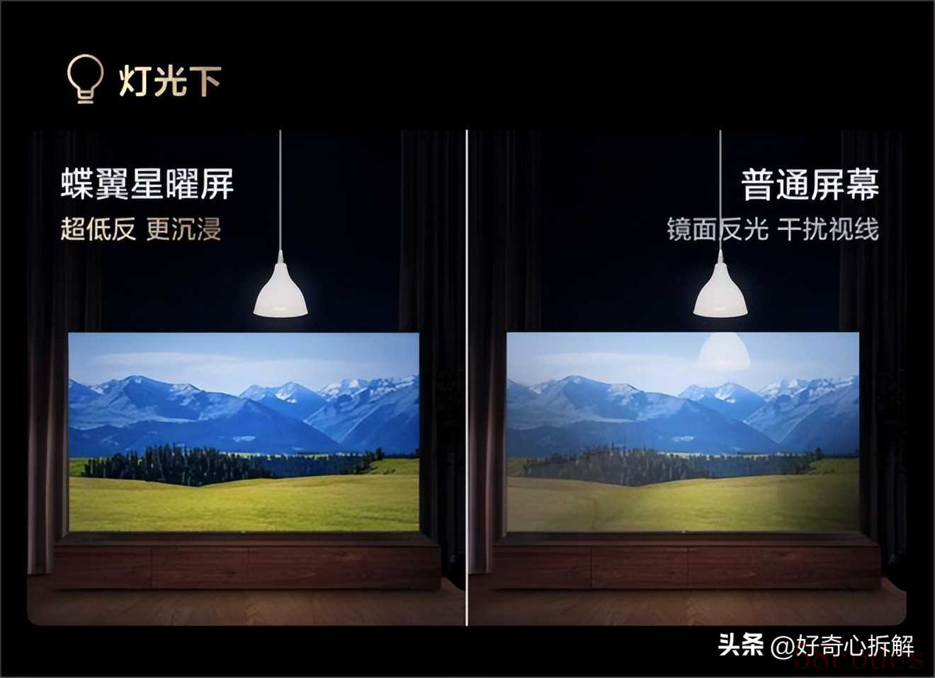 提到电视抗反光技术,目前主流的有AGLR屏和镜面低反屏两种。先说说AGLR屏,它企图通过在屏幕表面做微结构处理打散外界光线来减少反光,最终却既没获得理想的抗反效果,强光下依然会有模糊的光雾感,又因为其“磨砂”特性会让画面边缘易模糊、色彩通透度下降,再加上成本也较高,对于消费者而言完全是“花钱买罪受”;而镜面低反屏则完美解决这一痛点,既能有效抑制外界光线反射,明亮环境下也不会出现刺眼光斑或倒影,更关键的是它不会损伤画质,反而能让画面色彩更鲜艳、细节更清晰、对比度更出色,真正做到抗反与画质两手抓,花更少的钱能获得翻倍的体验。