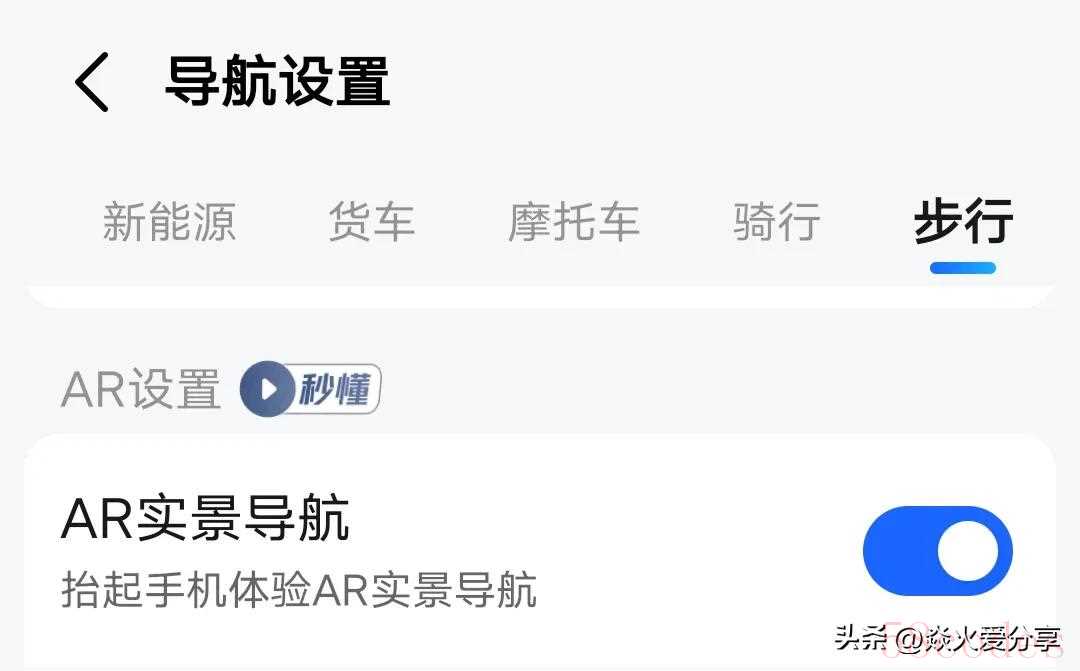 这个功能的打开方法,同样是找到地图的导航设置,把上方的按钮切换成步行,然后在下面找到AR实景导航,打开就可以了。