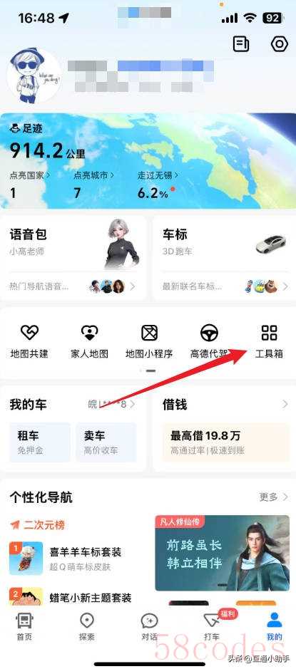 2、进入到我的页面,点击“工具箱”。