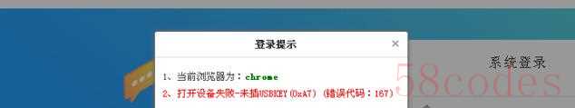 问题3:登录提示打开设备失败-未插USBKEY(0xA7)(错误代码:167)。如下图