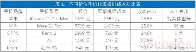 首先需要说明的是,官方售后中心在处理碎屏手机时,默认都是直接更换“总成屏”,即集成LCD/OLED屏幕、触控模块和外层保护玻璃的整套屏幕模组,所以价格都不便宜(表1)。