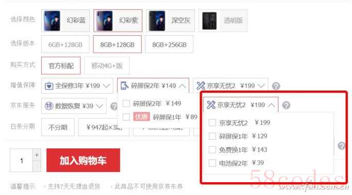 后者位于京东无忧的附加购买选项中,价格要高于普通碎屏保,但依旧略低于手机厂商官方碎屏险