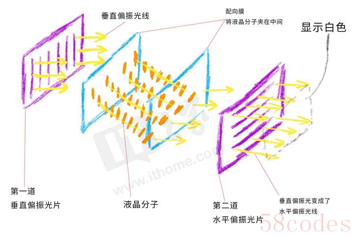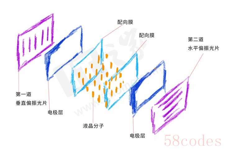 进入液晶层后,光线会随着液晶分子的扭曲方向而改变方向,如果液晶分子朝着水平方向扭曲,垂直偏振光穿过液晶层就会变成水平偏振光。