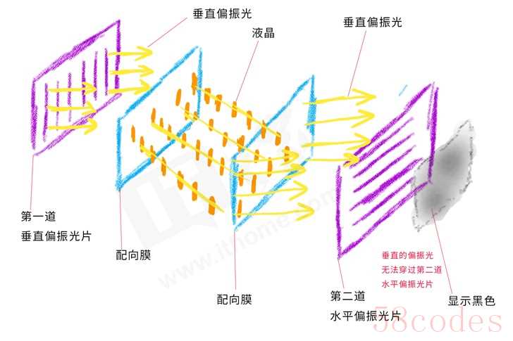 如果出来的是垂直偏振光,那它就无法通过第二道水平的偏振片,就会显示黑色。