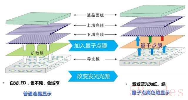 QD-LCD只是在液晶电视的背光源上加了一层量子点薄膜,用量子点技术来取代蓝光LED光学封装材料中的黄色萤光粉,从而让画质的色彩还原、色域、可视角度更上一层楼。