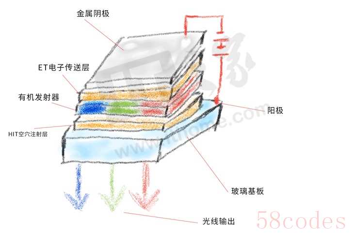 前面我们介绍LCD原理的时候,很复杂,从背光到显示到经过好多步骤,而OLED就简单了,它不需要背光,只是在两电极之间夹上有机发光层,当正负极电子在此有机材料中相遇时就会发光。这也是OLED的关键特性:自发光。