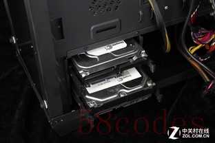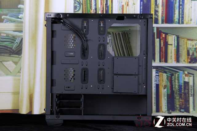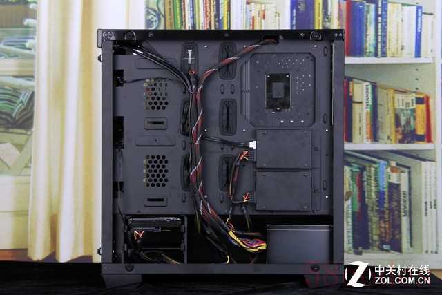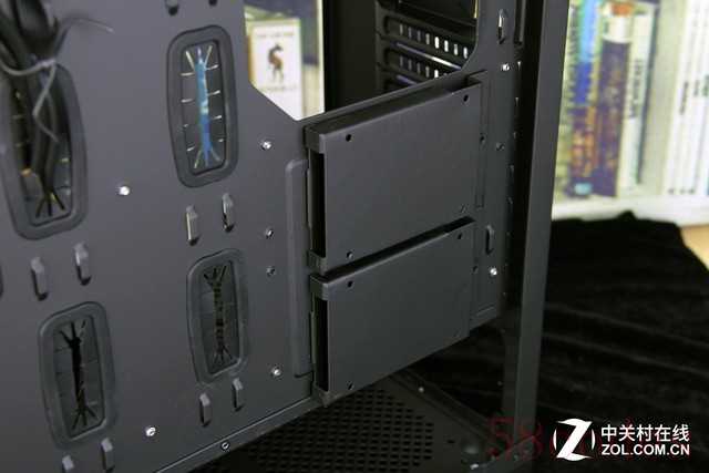 机箱为背线设计了专门的走线孔和扎线位,在实际的线缆布局时也有很好的实用性,布局在背板上的2.5英寸硬盘位可以让硬盘不多的平台有更整洁的效果。