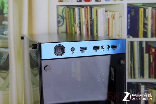 机箱的背部设计了一个风扇位,并有8条PCI拓展位,可以满足高端玩家的扩展需求。I/O区设计在前上部,这里分别布局了开机键,重启键及音频接口,并有2个USB 2.0接口和1个USB 3.0接口,音频接口采用了金属材质有更好的耐用性能。