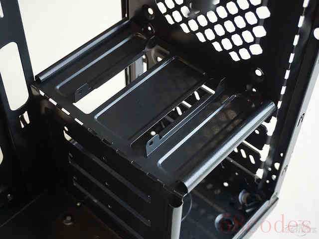 航嘉 暗夜猎手Ⅱ机箱设有1个5.25英寸光驱位,可扩展4个3.5英寸HDD和1个2.5英寸SSD硬盘。其中一个HDD位设置在光驱位正下方,其余三个设置在机箱下部,SSD位设置在底部HDD位的上方。这种侧插式的硬盘安装设计利于空间的节省,增强稳定性和有效散热。