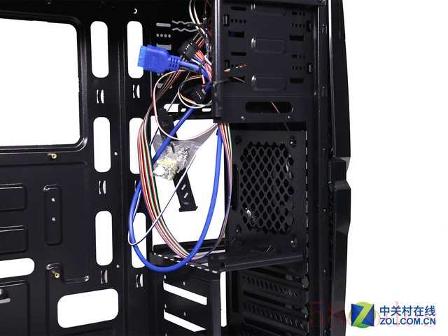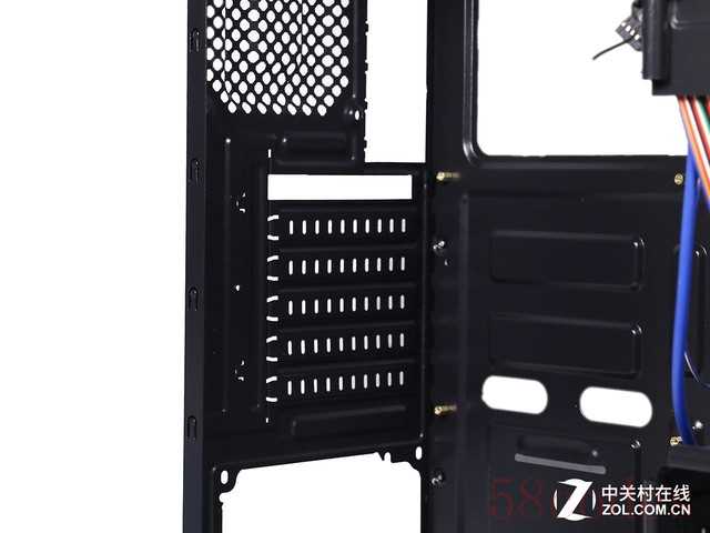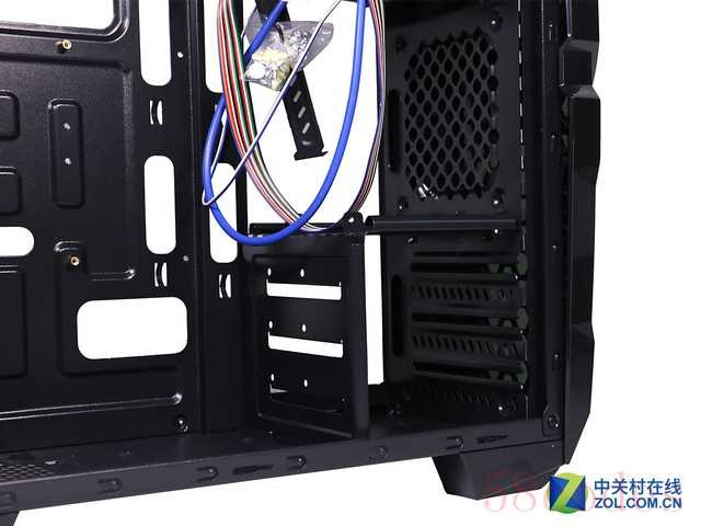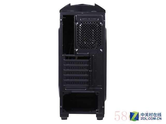 从机箱的后部,我们可以清晰的看到预留的一个风扇安装位置,并且还有六块PCI挡板,下至电源的设计也是一览无余。