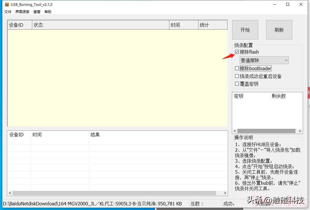 这时候会听到电脑有声音,就是发现新硬件的声音,然后USB_Burning_Tool软件也找到了设备,此时不要断开短路,稍微等几秒钟。此时上面进度条出现红色也没关系,撒开短路位置,它就会自动继续变绿进行烧录。