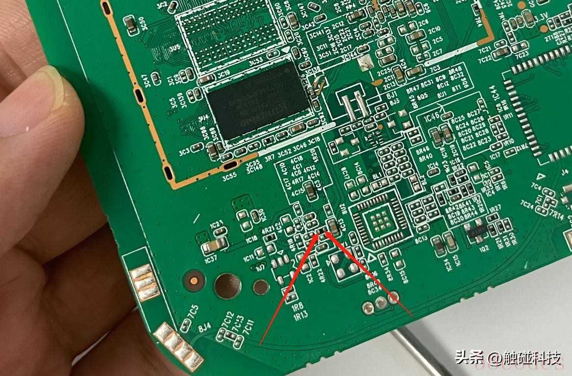 短路的位置在背面闪存颗粒的下方,大家仔细找找4C13这颗电阻,然后短路位置就在它的旁边。短路方法就是镊子两端分别搭载电阻两侧,不用分正负极,搭上就可以了。