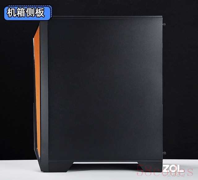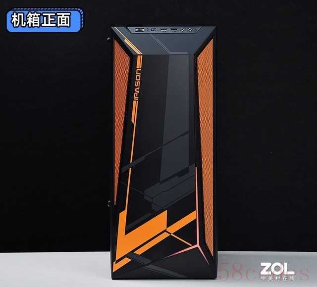攀升战境S5主机采用中塔式设计,黑色+橙色涂装,主体为黑色,橙色点缀机箱纹路和LOGO。黑色本是经典电竞颜色,主流的电竞主机都习惯使用黑色,所以从外观上就可以看出这台主机的定位。