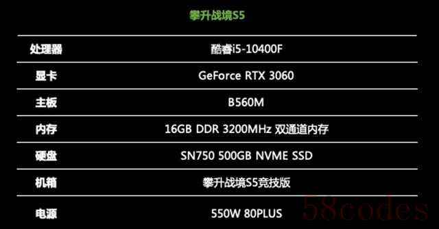 攀升战境S5主机采用酷睿i5-10400F处理器,双8GB内存,500GB固态,显卡为RTX 3060显卡,配置属于中端游戏主机。