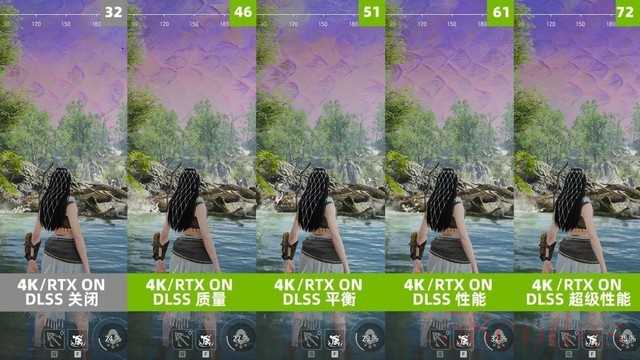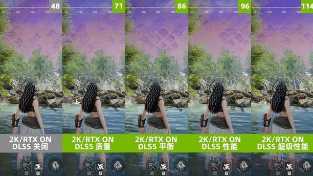 可以看到在不开DLSS的情况下,这台主机玩《永劫无间》的帧数是48帧左右,而开启DLSS后,帧数都超过了60帧以上,其中超级性能模式下帧数更是达到了114帧,实现翻倍的帧数提升。不过要注意的是,DLSS4个等级对于画质的感官也不同,质量模式毫无疑问是最接近原生画质的,其次是平衡和性能,到了超级性能画面会出现明显的模糊。所以一般建议DLSS选择平衡和性能模式,超级性能只建议追求帧数而不看重画质的用户选择。