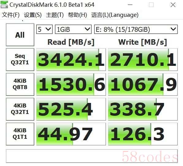 NVMe协议的固态速度就是不一样,读取达到了3424.1MB/s,写入达到了2710.1MB/s,远超一般的SATA协议硬盘。