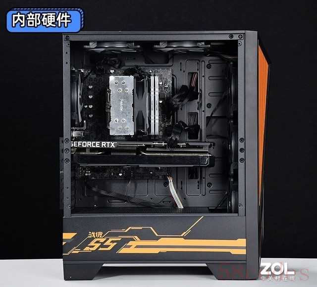 拆开亚克力面板可以清晰地看到里面的硬件,总共有6个机箱风扇,主板为M-ATX板型,散热器为风冷,双通道内存,还有RTX 3060显卡。机箱内部空间也相对富裕,后续升级更换硬件也比较方便。
