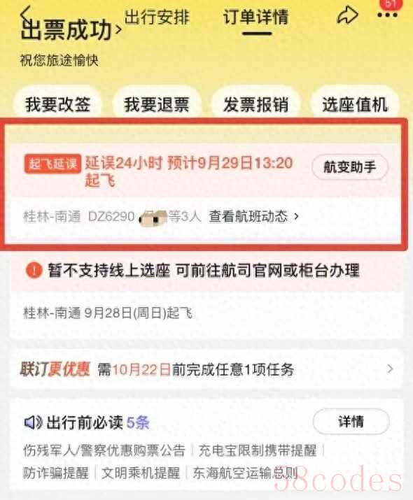 保女士称,她于9月2日为父亲、母亲和奶奶三位老人购买了东海航空9月28日13:20由广西桂林飞往江苏南通的DZ6290航班。9月22日,家人收到购票平台通知:飞机延误24小时,预计9月29日13:20起飞。