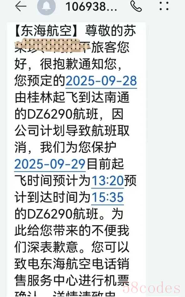 很快,保女士的家人也收到了东海航空发来的信息:您预定的2025年9月28日由桂林起飞到达南通的DZ6290航班,因公司计划导致航班取消,我们为您保护2025年9月29日目前起飞时间预计为13:20、预计到达时间为15:35的DZ6290航班……