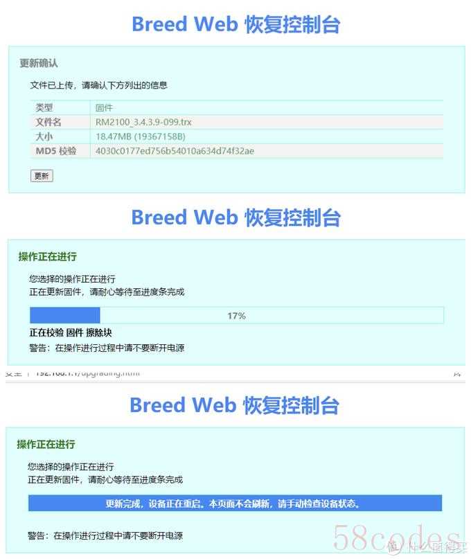 ⑮确认刷机包无误。等待刷机进度条走完,路由会自动重启但页面不会刷新