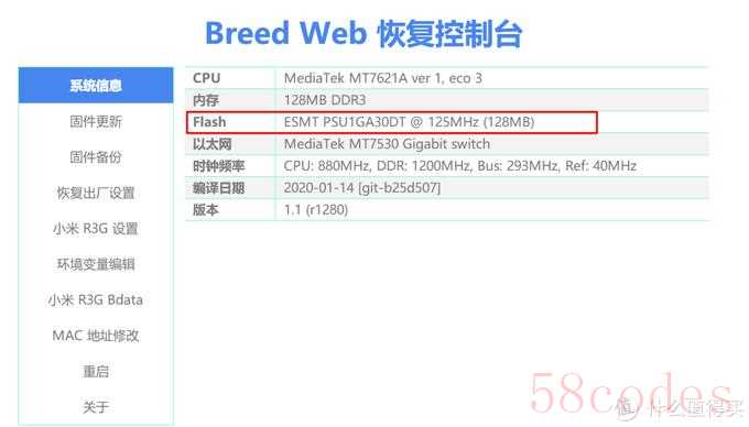 ▼浏览器输入“192.168.1.1”进入Breed Web页面,这里也可以看到刷机路由的配置,最有用的就是可以看到这台红米的内存芯片,像我这台的FLASH就是ESMT,稳了。
