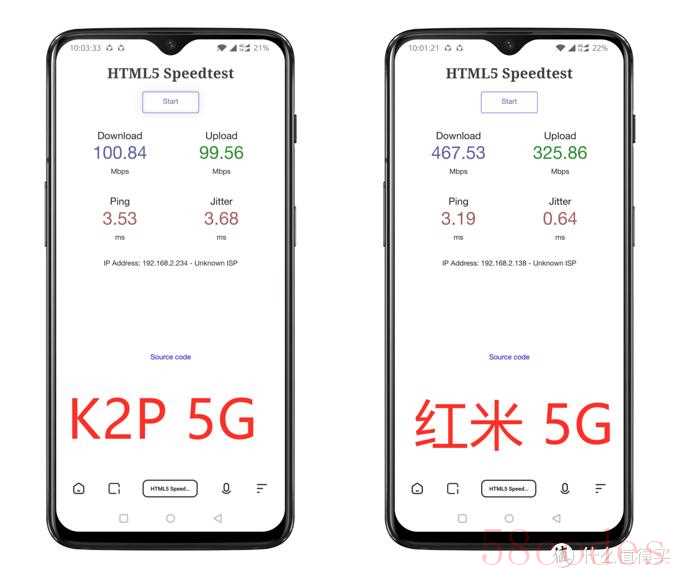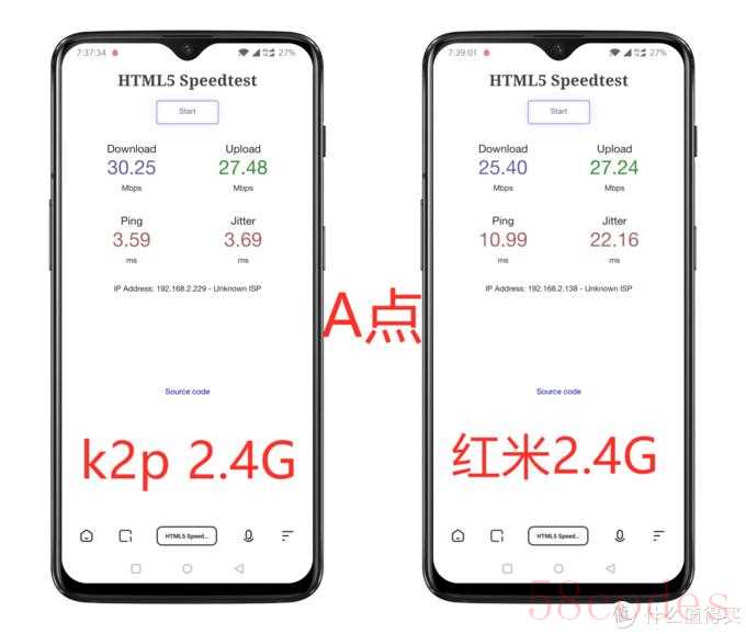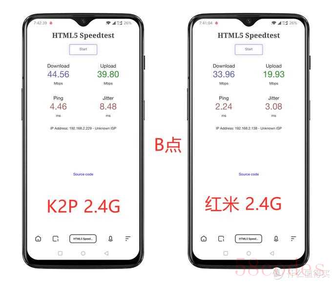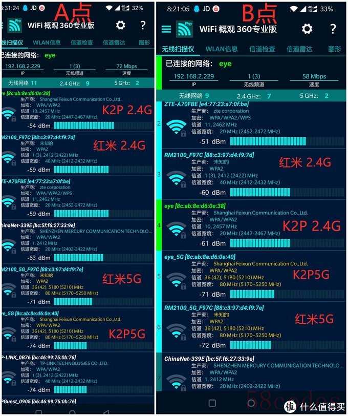 AB两点,不管是2.4G还是5G,两款路由信号极其相近,这个点可能K2P强,手机左手换到右手可能就是红米强,简单说两者信号真的近似的不得了。