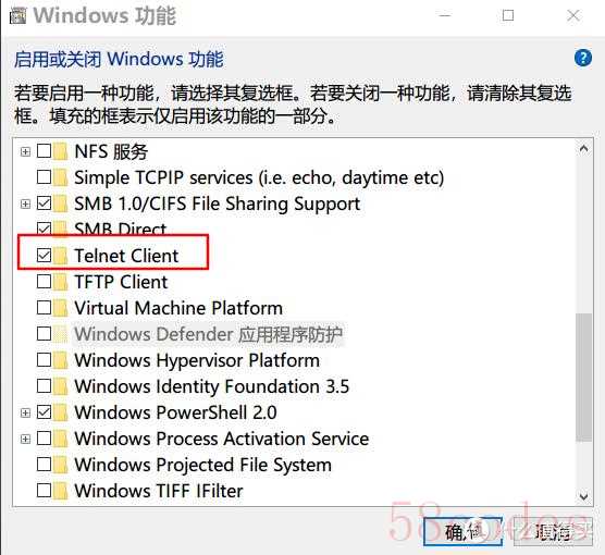 Win+R 打开运行窗口, 输入 “OptionalFeatures” 打开 Windows 功能.下拉找到Telnet Client在前面的方框里打钩-确定