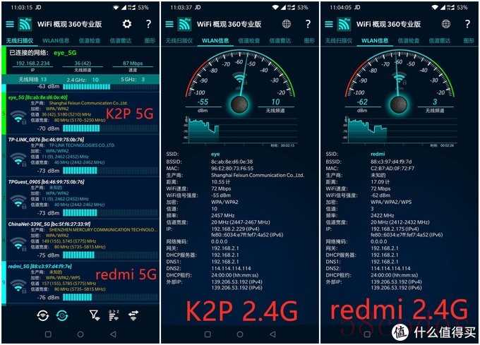 2.4G:K2P信号强度-55dBm(距离10.55),红米-62dBm(距离17.09),速度都是72Mbps,可以说两者差不多。