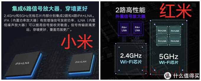 两款路由硬件都差不多,不过红米多了2个外置信号放大器,理论来说红米更强。注意一点小米的商品页面宣传的”集成6路信号放大器“指的是得是芯片集成而不是单独的独立功放。