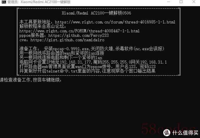 ▼双击固件包里的“一键开启telnet.bat”文件,对照弹出的命令检查前面的工作是否无误,没问题的话输入“Y”回车。