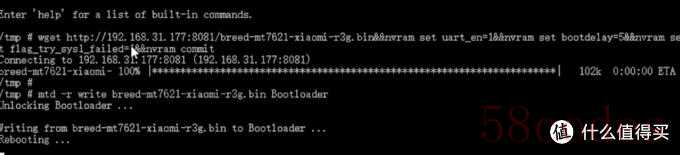 wget http://192.168.31.177:8081/breed-mt7621-xiaomi-r3g.bin&&nvram set uart_en=1&&nvram set bootdelay=5&&nvram set flag_try_sys1_failed=1&&nvram commit