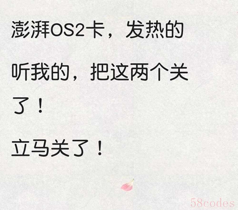 差点就想刷回老版本了升级澎湃os2后,一直很卡,刷什么都卡,续航倒没特别变化,但是卡顿,发热,卡的都像10年前的安卓了,网络也卡(甚至把5g切回4g了),本来已经灰心想放弃了,刷回老版本养养老好了,突然灵机一动去开发者选项设置里试一下,关了图23这两个设置后,重启,然后就突然变流畅了,体验到了久违的丝滑,人都变通畅了!!!发热也改善了!