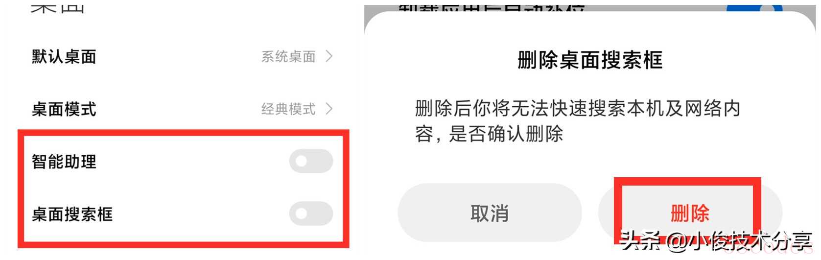 同样在桌面设置中,找到【智能助理】以及【桌面搜索框】把开关关掉!接着选择【删除按钮】即可把桌面搜索框删掉,此时再看我们是手机桌面就会显得整洁了!