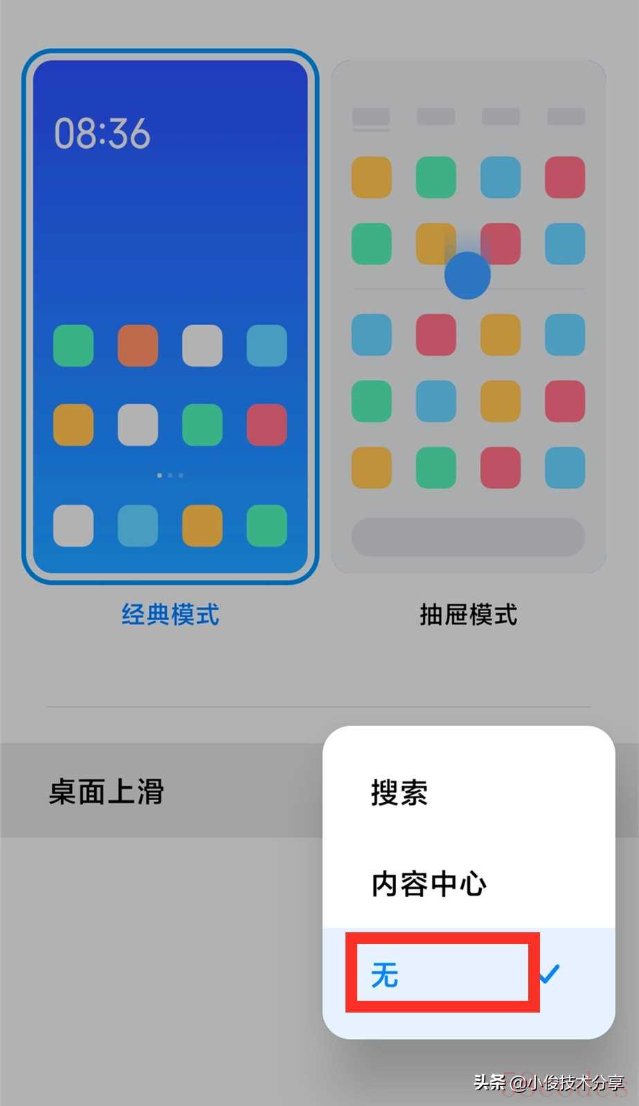 在桌面设置里面,打开桌面模式并选择为【经典】,接着把桌面上滑选择为【无】不能选择为内容或搜索,因为我们在使用全面屏的时候一不小心往上滑就会触碰到这些操作,所以设置为无可以减少这些不必要的麻烦!