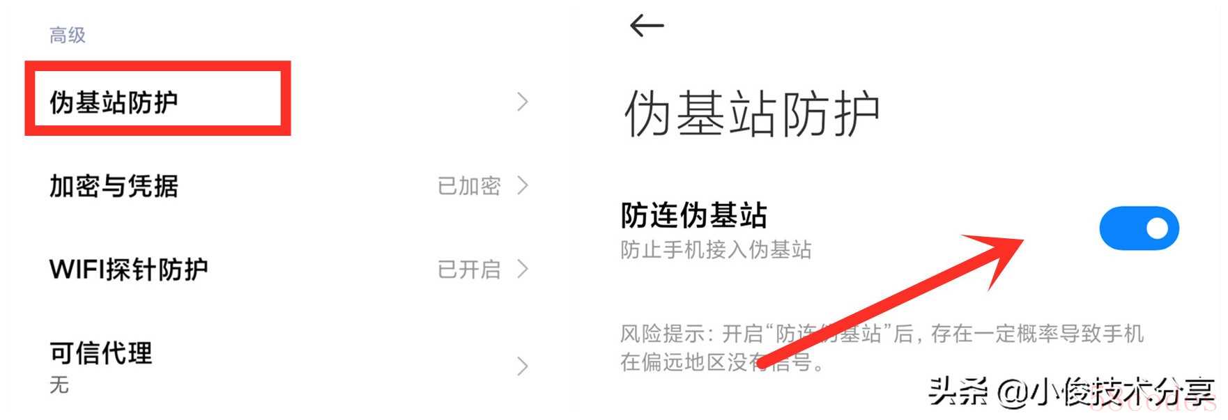 打开后,就有个伪基站防护开关,我们手动给它打开就可以了!