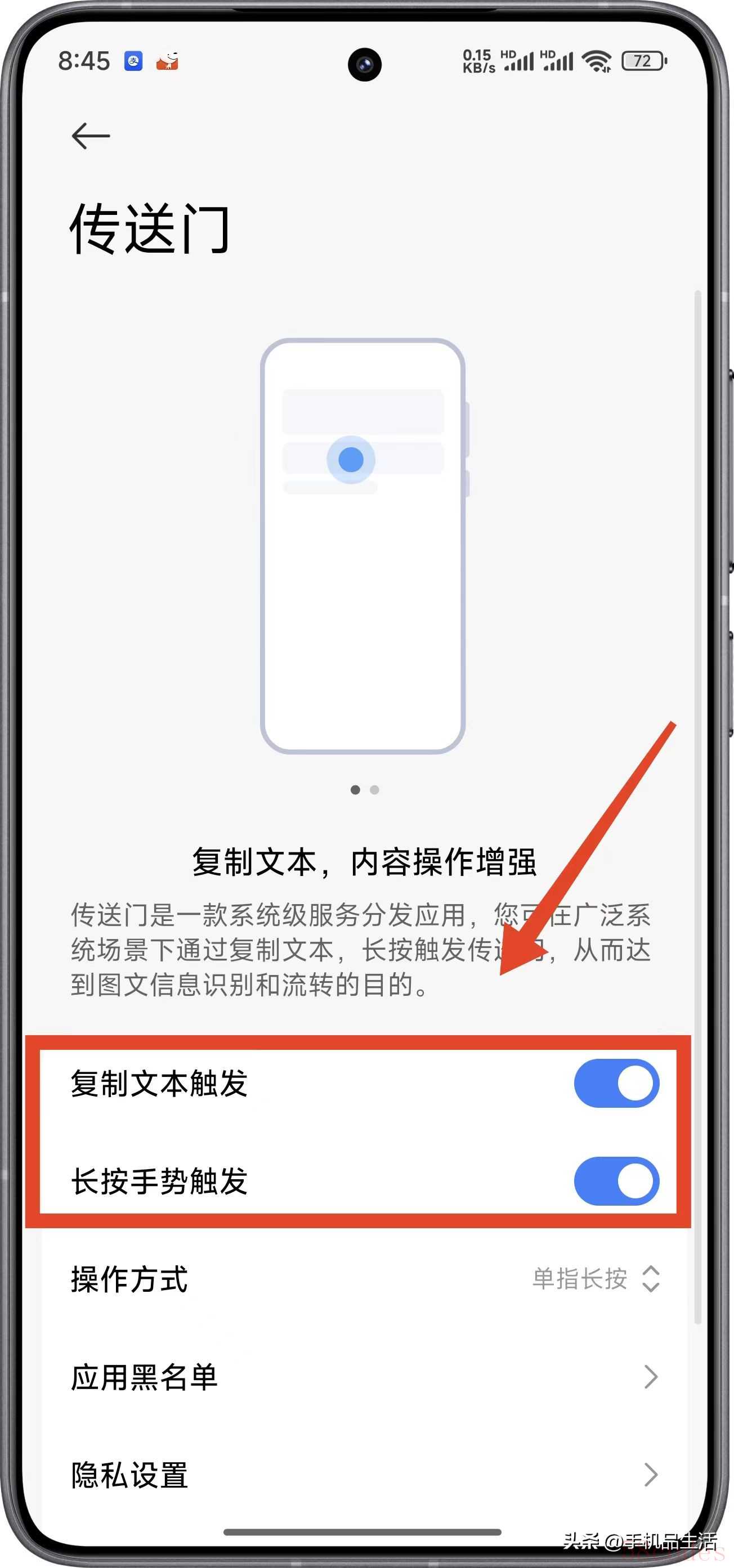 打开设置——更多设置——传送门,将“复制文本触发”和“长按手势触发”都打开,这样就可以随时识别文字和图片,轻松复制想要的文字了。