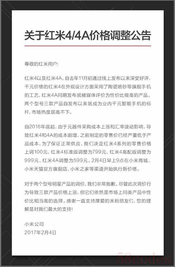 不过由于2016年底的“元器件采购成本上涨”与“汇率波动”,同时为了红米4系列继续供应,小米在今天正式调整了红米4系列的官方销售价格,整体上调100元。目前,小米官方商城、天猫小米官方旗舰店以及小米之家售价均已调整。