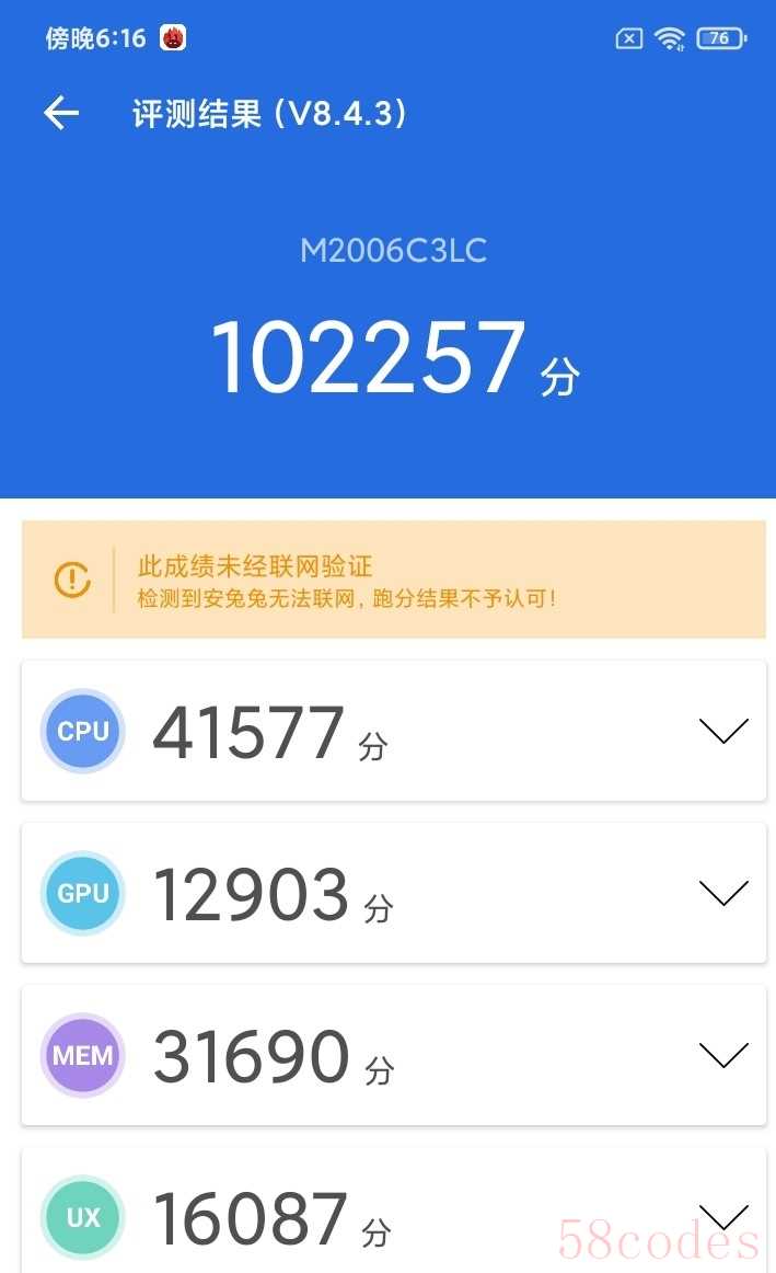 由于笔者是在发布前拿到的评测机,出于保密需要,所有需要联网使用的跑分软件都无法使用。这里用安兔兔简单测试了一下,看到Redmi 9A的跑分能超过10万,这样的成绩要好于目前还在服役的骁龙625机型(普遍在九万多分)。