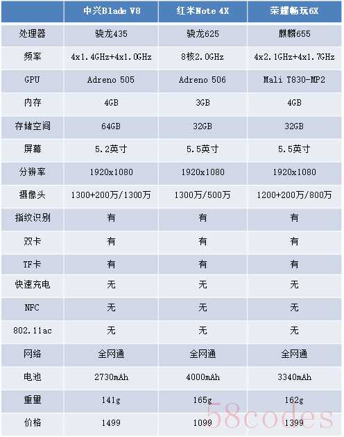 这次选择的是中兴Blade V8,红米Note 4X,以及荣耀畅玩6X。其中红米Note 4X报价999元,但如果不抢购,就需要1099元购买,因此也选入其中。
