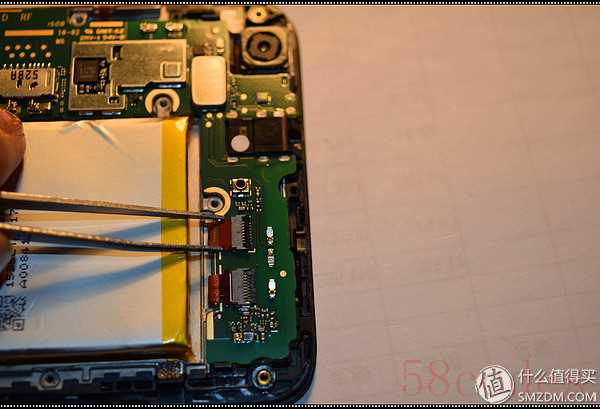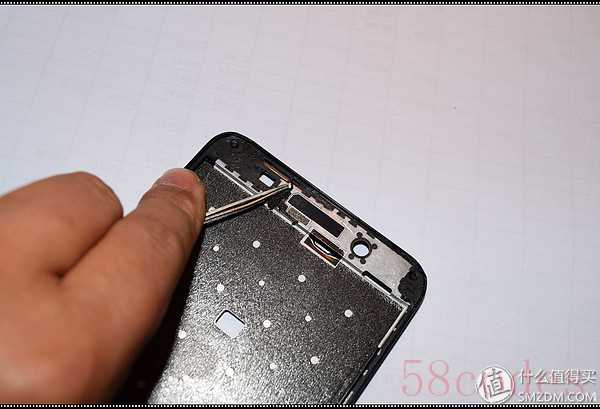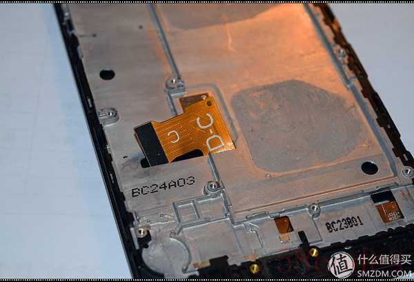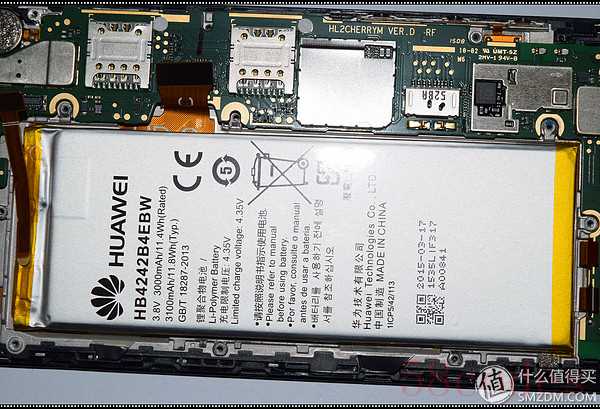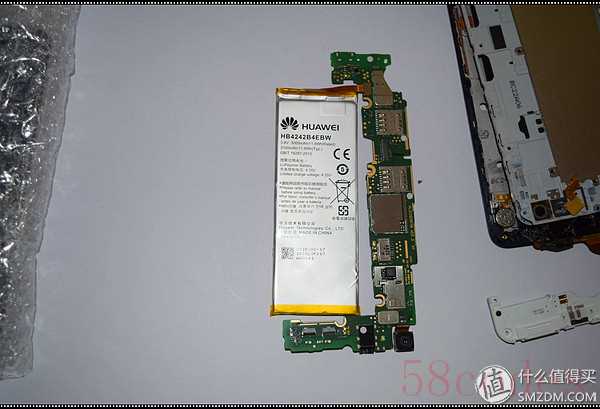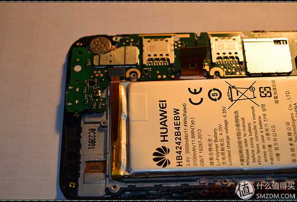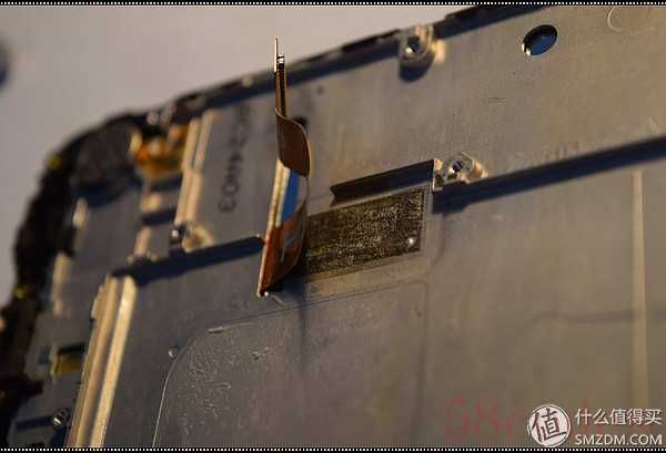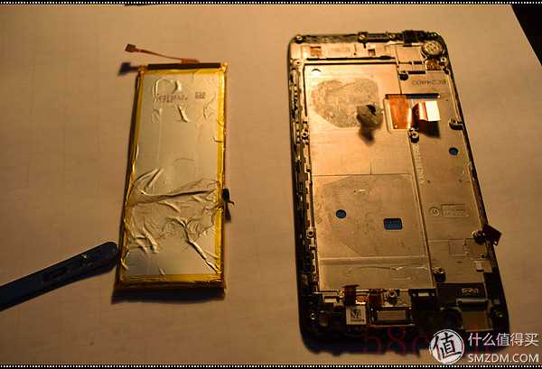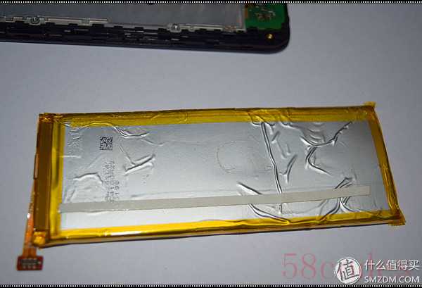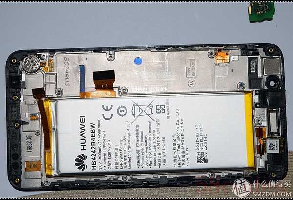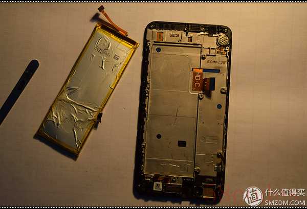 在所有螺丝和周围框架去除后,打开机身背面面积最大的背板,可以看到一块3100mAh锂电池和手机主板。值得一提的是,手机背板采用与电池大小的一块金属,并为电池留有一定的厚度空间,一方面可以让二者更为贴合,另外也可以帮助电池散热。